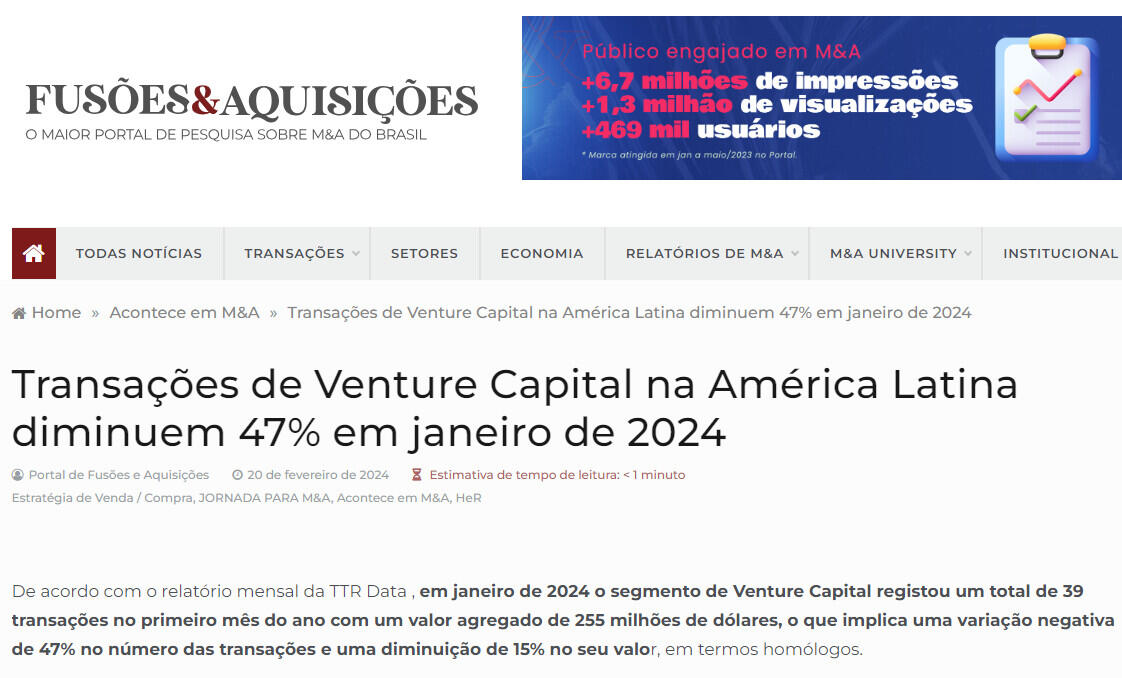 De acordo com o relatório mensal da TTR Data , em janeiro de 2024 o segmento de Venture Capital registou um total de 39 transações no primeiro mês do ano com um valor agregado de 255 milhões de dólares, o que implica uma variação negativa de 47% no número das transações e uma diminuição de 15% no seu valor, em termos homólogos.