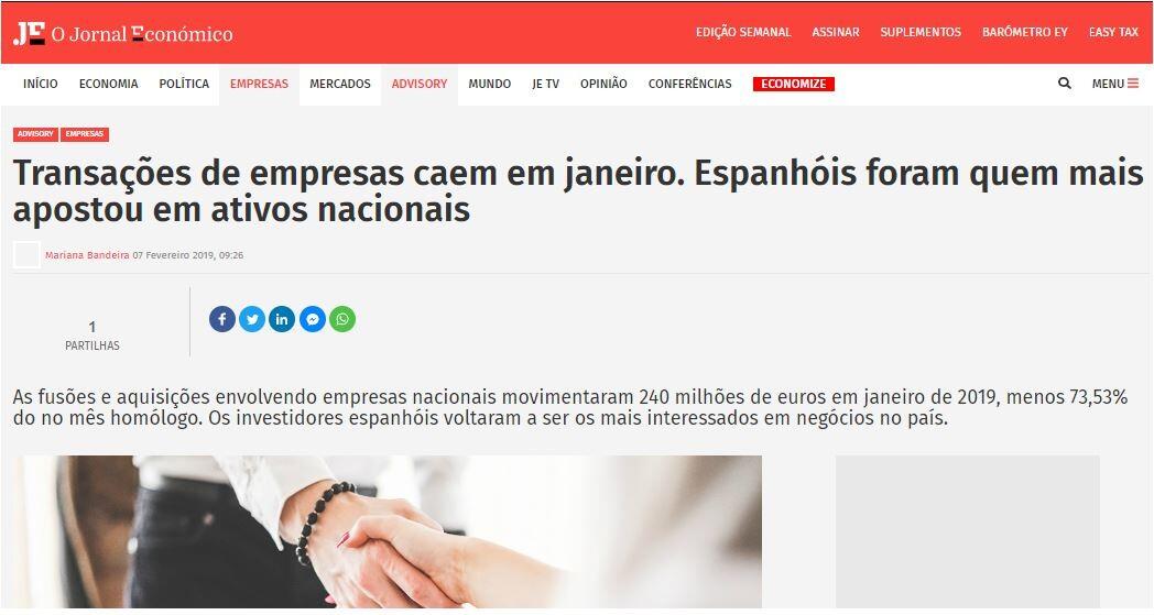 As fusões e aquisições envolvendo empresas nacionais movimentaram 240 milhões de euros em janeiro de 2019, menos 73,53% do no mês homólogo. Os investidores espanhóis voltaram a ser os mais interessados em negócios no país.