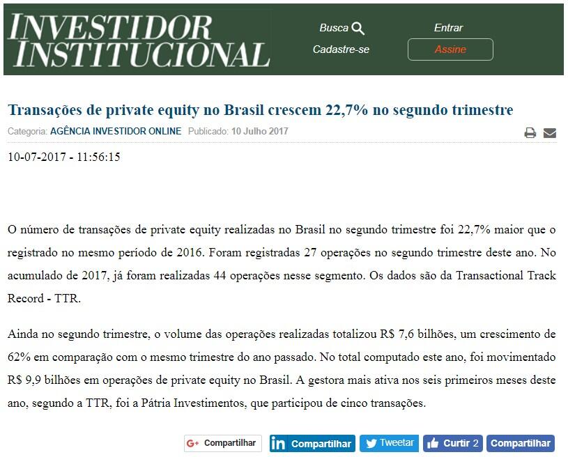 O número de transações de private equity realizadas no Brasil no segundo trimestre foi 22,7% maior que o registrado no mesmo período de 2016. Foram registradas 27 operações no segundo trimestre deste ano. No acumulado de 2017, já foram realizadas 44 operações nesse segmento. Os dados são da Transactional Track Record - TTR.