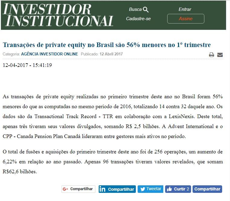 As transações de private equity realizadas no primeiro trimestre deste ano no Brasil foram 56% menores do que as computadas no mesmo período de 2016, totalizando 14 contra 32 daquele ano. Os dados são da Transactional Track Record - TTR em colaboração com a LexisNexis. Deste total, apenas três tiveram seus valores divulgados, somando R$ 2,5 bilhões. A Advent International e o CPP - Canada Pension Plan Canadá lideraram entre gestores mais ativos no período.