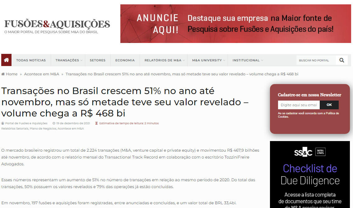 O mercado brasileiro registrou um total de 2.224 transações (M&A, venture capital e private equity) e movimentou R$ 467,9 bilhões até novembro, de acordo com o relatório mensal do Transactional Track Record em colaboração com o escritório TozziniFreire Advogados.