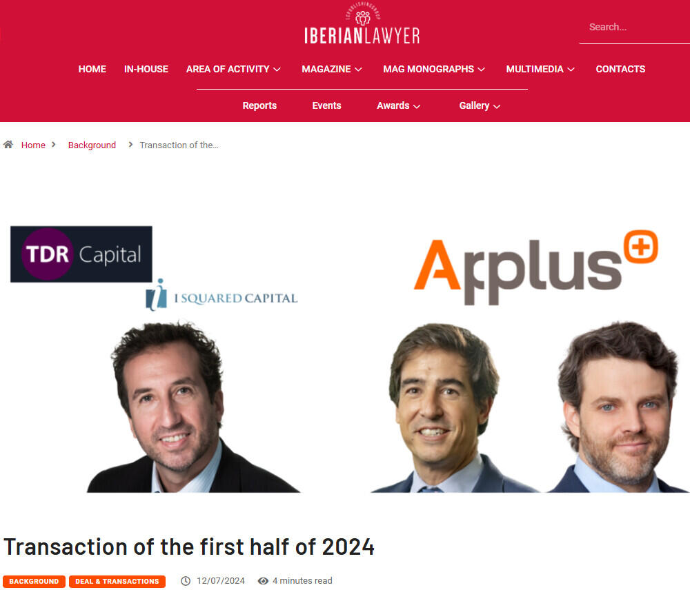 For the first half of 2024, TTR Data has selected as a highlighted transaction the takeover bid of I Squared Capital and TDR Capital (Amber EquityCo) for Applus+, through which they have acquired 70.65% of the company for approximately EUR 1.65 bn.
