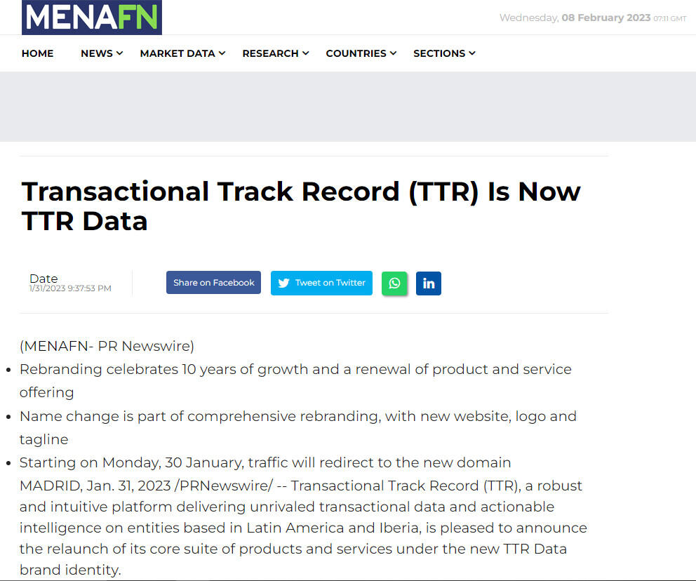 MADRID, Jan. 31, 2023 /PRNewswire/ -- Transactional Track Record (TTR), a robust and intuitive platform delivering unrivaled transactional data and actionable intelligence on entities based in Latin America and Iberia, is pleased to announce the relaunch of its core suite of products and services under the new TTR Data brand identity.