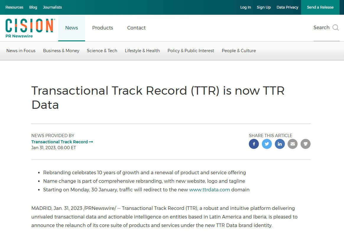 MADRID, Jan. 31, 2023 /PRNewswire/ -- Transactional Track Record (TTR), a robust and intuitive platform delivering unrivaled transactional data and actionable intelligence on entities based in Latin America and Iberia, is pleased to announce the relaunch of its core suite of products and services under the new TTR Data brand identity.
