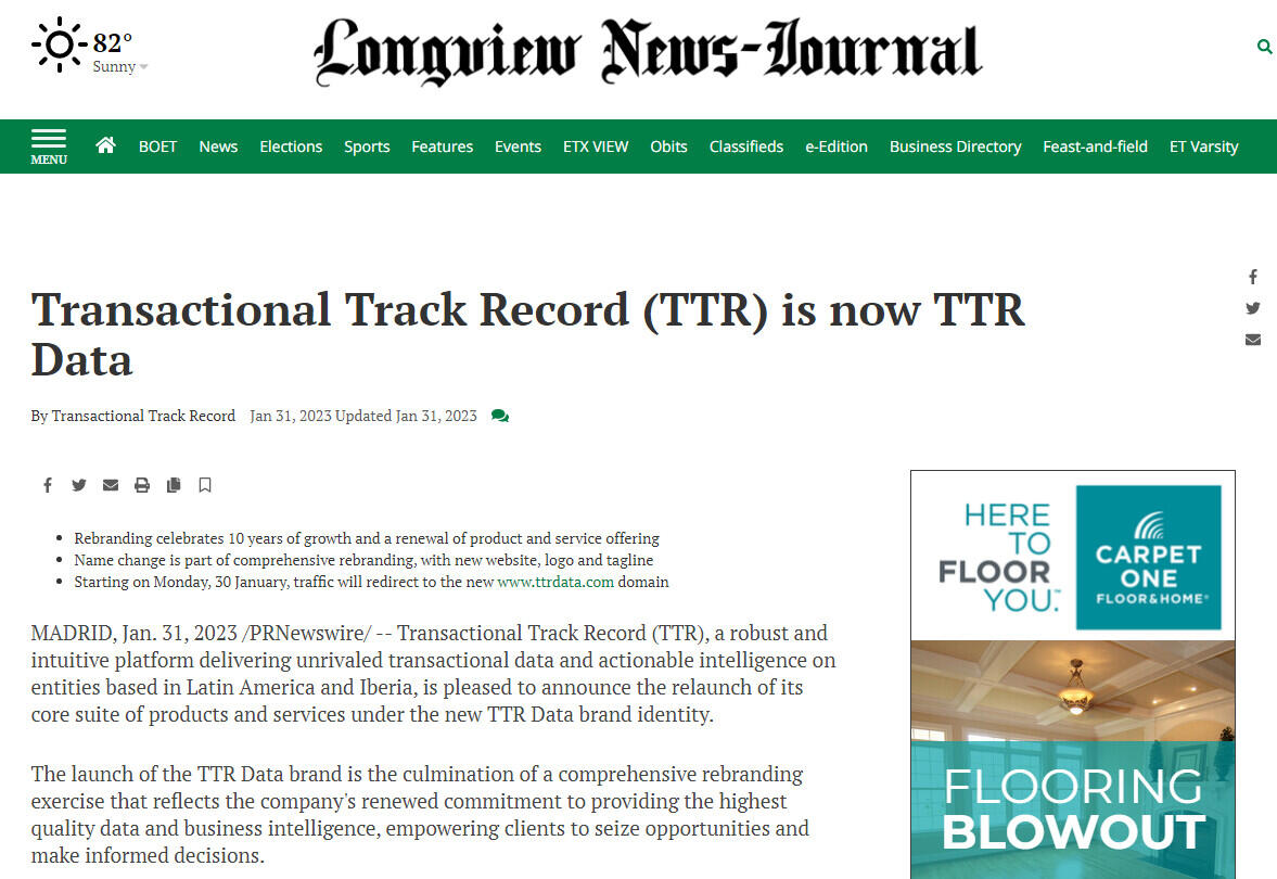 MADRID, Jan. 31, 2023 /PRNewswire/ -- Transactional Track Record (TTR), a robust and intuitive platform delivering unrivaled transactional data and actionable intelligence on entities based in Latin America and Iberia, is pleased to announce the relaunch of its core suite of products and services under the new TTR Data brand identity.