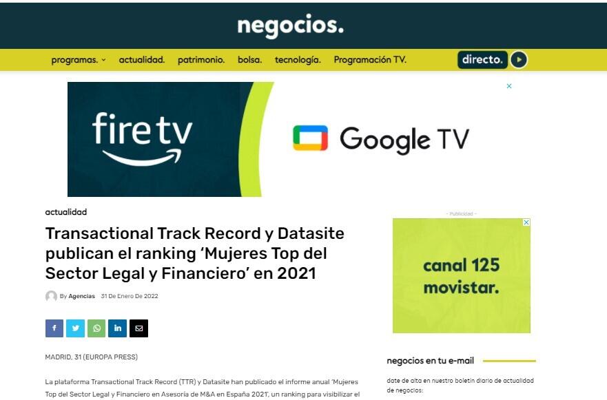 Transactional Track Record y Datasite publican el ranking ‘Mujeres Top del Sector Legal y Financiero’ en 2021