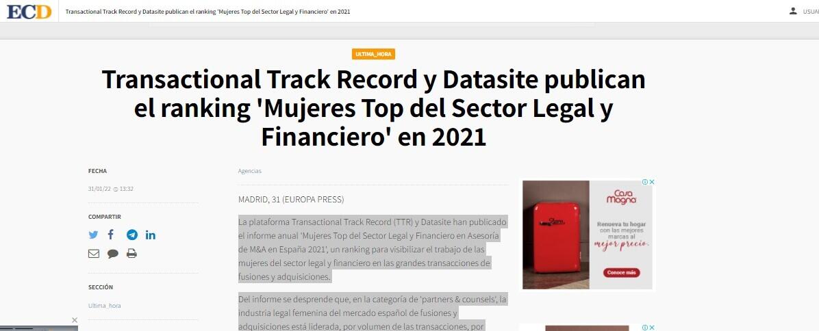 Transactional Track Record y Datasite publican el ranking 'Mujeres Top del Sector Legal y Financiero' en 2021