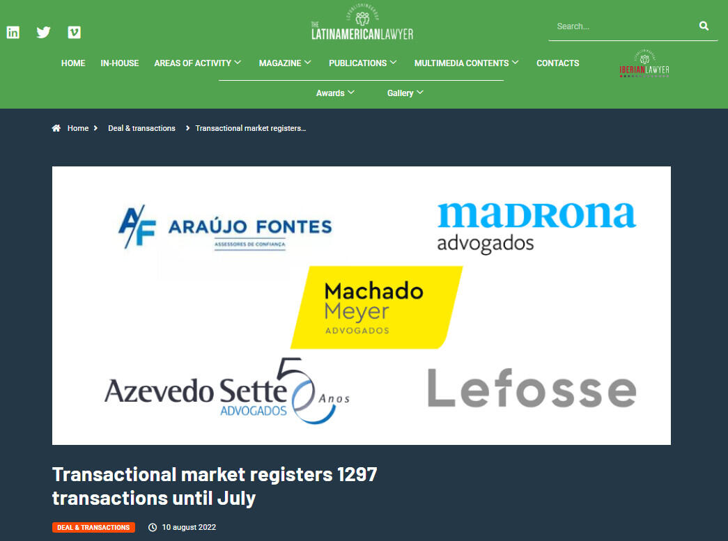 The Brazilian transactional market recorded, according to the Transactional Track Record (TTR), 1297 transactions until July 2022.