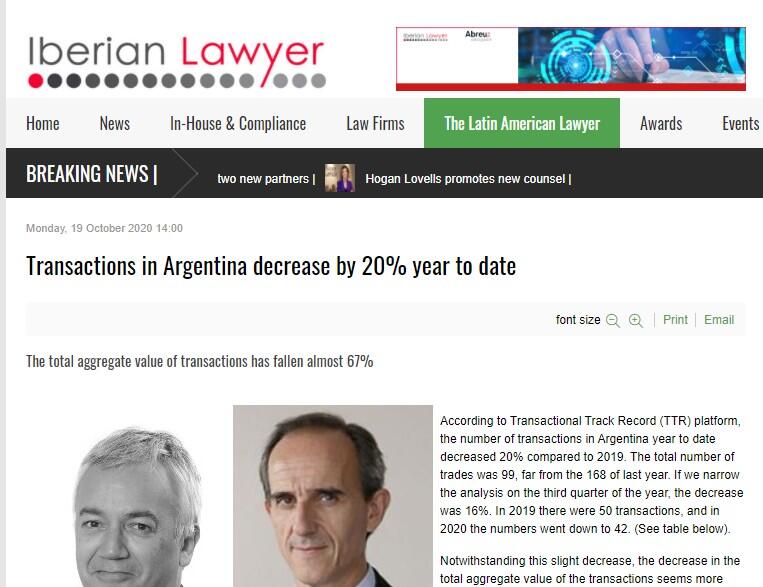 According to Transactional Track Record (TTR) platform, the number of transactions in Argentina year to date decreased 20% compared to 2019. The total number of trades was 99, far from the 168 of last year. If we narrow the analysis on the third quarter of the year, the decrease was 16%. In 2019 there were 50 transactions, and in 2020 the numbers went down to 42. (See table below).