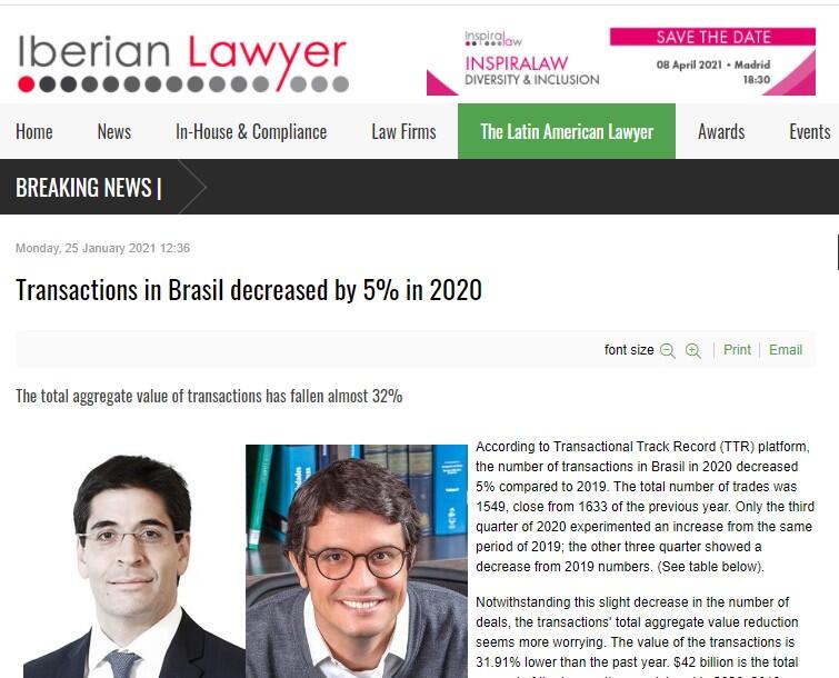 According to Transactional Track Record (TTR) platform, the number of transactions in Brasil in 2020 decreased 5% compared to 2019. The total number of trades was 1549, close from 1633 of the previous year. Only the third quarter of 2020 experimented an increase from the same period of 2019; the other three quarter showed a decrease from 2019 numbers. (See table below).