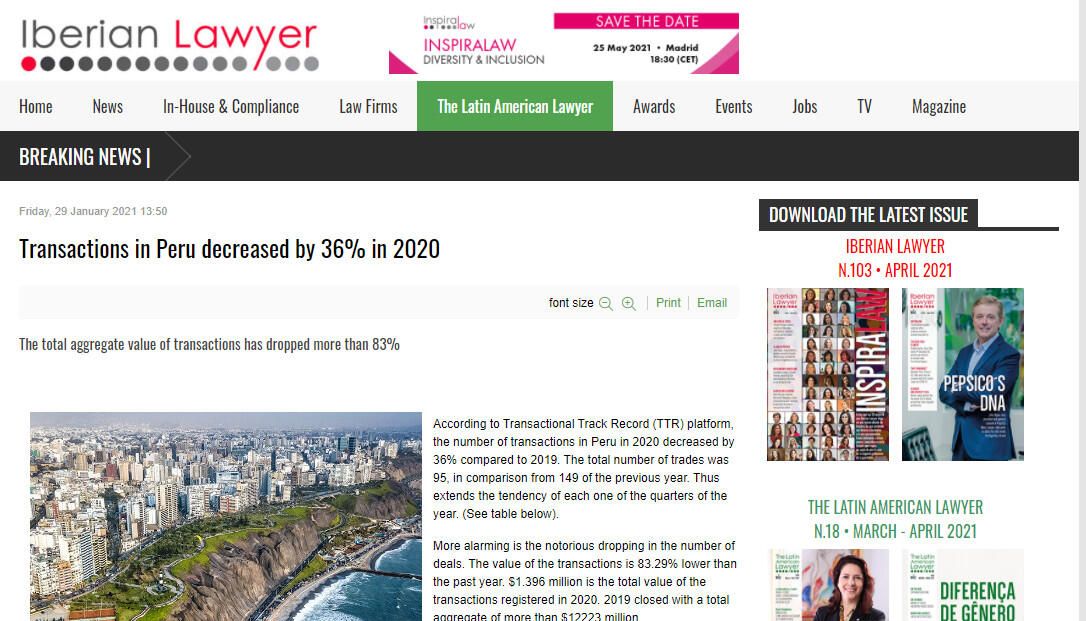 According to Transactional Track Record (TTR) platform, the number of transactions in Peru in 2020 decreased by 36% compared to 2019. The total number of trades was 95, in comparison from 149 of the previous year. Thus extends the tendency of each one of the quarters of the year. (See table below).