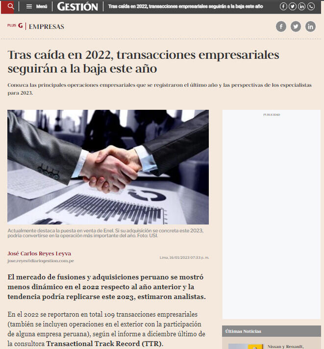 En el 2022 se reportaron un total 109 transacciones empresariales (también se incluyen operaciones en el exterior con la participación de alguna empresa peruana, según el informe a diciembre último de la consultora Transactional Track Record (TTR).