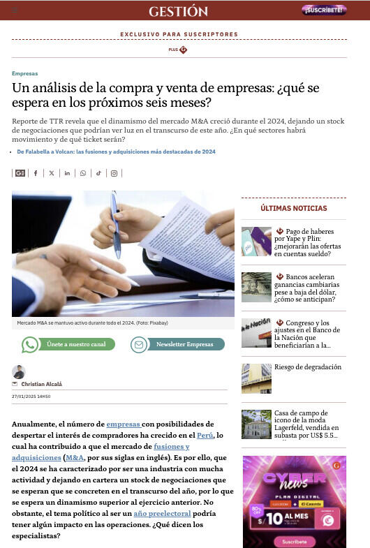 Anualmente, el número de empresas con posibilidades de despertar el interés de compradores ha crecido en el Perú, lo cual ha contribuido a que el mercado de fusiones y adquisiciones (M&A, por sus siglas en inglés). Es por ello, que el 2024 se ha caracterizado por ser una industria con mucha actividad y dejando en cartera un stock de negociaciones que se esperan que se concreten en el transcurso del año, por lo que se registraría un dinamismo superior al ejercicio anterior. No obstante, el tema político al ser un año preelectoral podría tener algún impacto en las operaciones. ¿Qué dicen los especialistas?