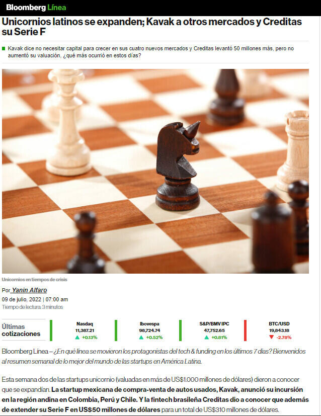 Esta semana dos de las startups unicornio (valuadas en más de US$1.000 millones de dólares) dieron a conocer que se expandían. La startup mexicana de compra-venta de autos usados, Kavak, anunció su incursión en la región andina en Colombia, Perú y Chile. Y la fintech brasileña Creditas dio a conocer que además de extender su Serie F en US$50 millones de dólares para un total de US$310 millones de dólares.