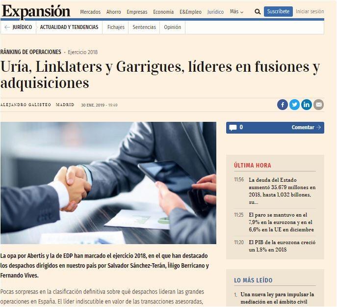 Uría, Linklaters y Garrigues, líderes en fusiones y adquisiciones
