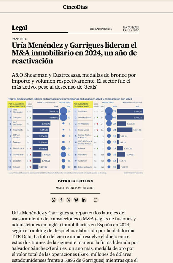 Uría Menéndez y Garrigues se reparten los laureles del asesoramiento de transacciones o M&A (siglas de fusiones y adquisiciones en inglés) inmobiliarias en España en 2024, según el ranking de despachos elaborado por la plataforma TTR Data. La foto del cierre anual resuelve el duelo entre estos dos titanes de la siguiente manera: la firma liderada por Salvador Sánchez-Terán es, un año más, medalla de oro por el valor total de las operaciones (5.973 millones de dólares estadounidenses frente a 5.895 de Garrigues) mientras que el despacho capitaneado por Fernando Vives se alza de nuevo con el primer puesto en el ranking por número de asesoramientos (73 frente a 69). En ambos podios los acompañan A&O Shearman (3.999 millones) y Cuatrecasas (37 operaciones).