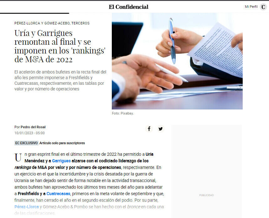 Uría y Garrigues remontan al final y se imponen en los 'rankings' de M&A de 2022
