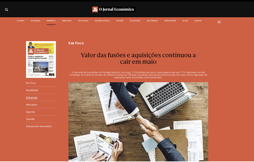 Em maio, foram registadas 36 fusões e aquisições, entre anunciadas e encerradas, e um valor total de 1,1 mil milhões de euros.