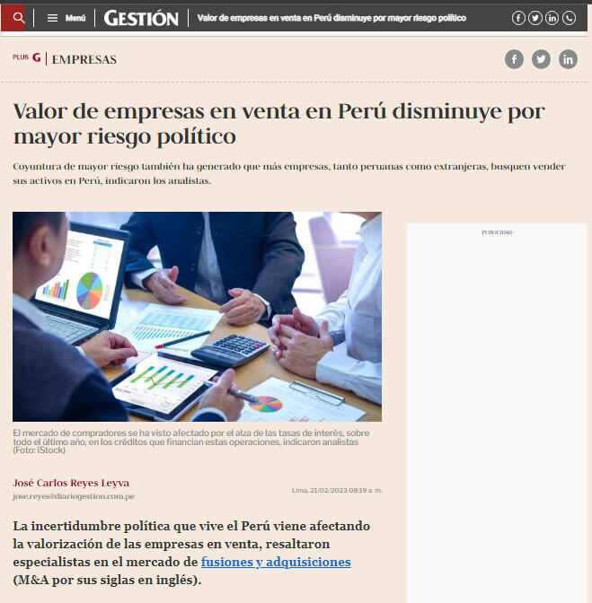 Valor de empresas en venta en Perú disminuye por mayor riesgo político