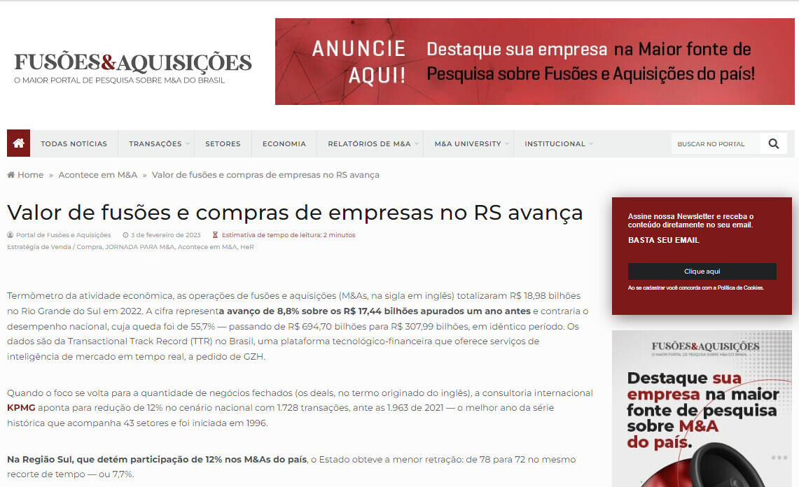 Termômetro da atividade econômica, as operações de fusões e aquisições (M&As, na sigla em inglês) totalizaram R$ 18,98 bilhões no Rio Grande do Sul em 2022. A cifra representa avanço de 8,8% sobre os R$ 17,44 bilhões apurados um ano antes e contraria o desempenho nacional, cuja queda foi de 55,7% — passando de R$ 694,70 bilhões para R$ 307,99 bilhões, em idêntico período. Os dados são da Transactional Track Record (TTR) no Brasil, uma plataforma tecnológico-financeira que oferece serviços de inteligência de mercado em tempo real, a pedido de GZH.