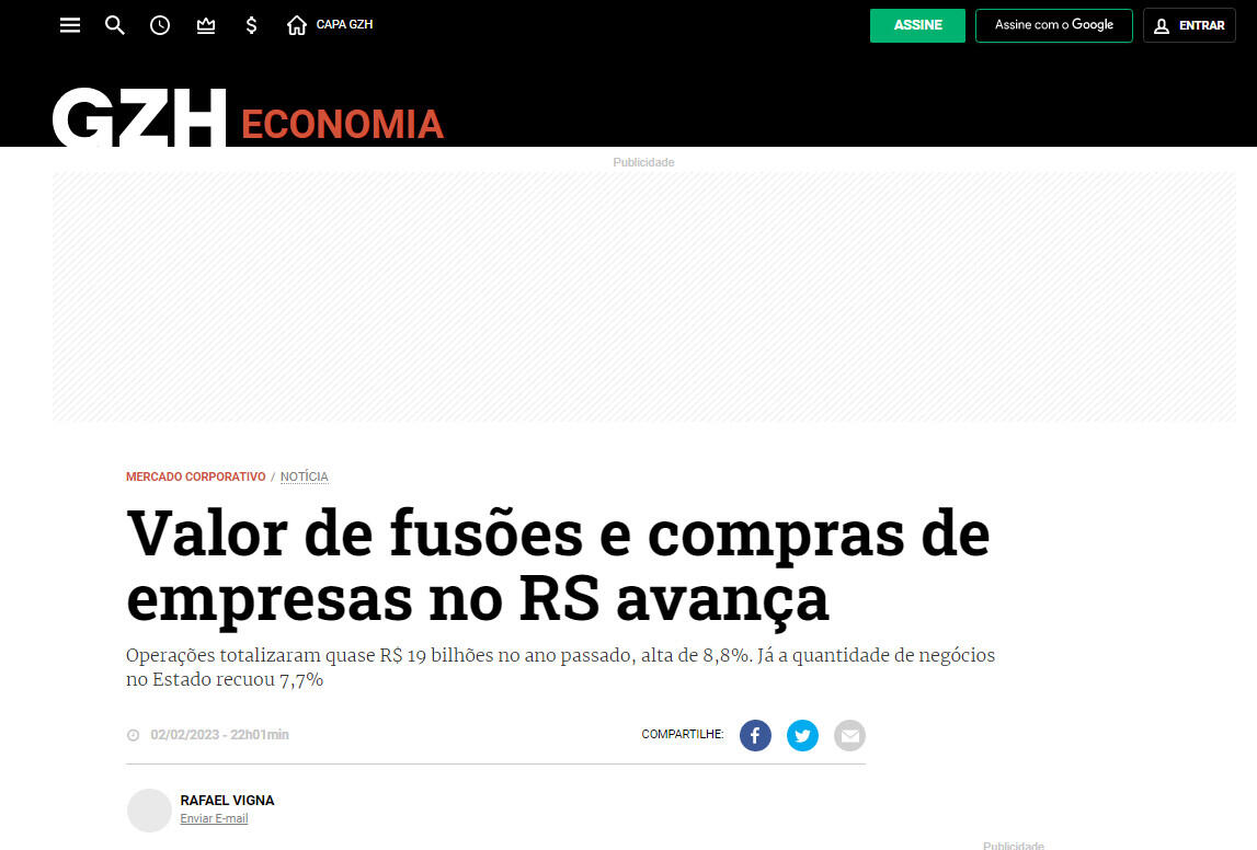 Termômetro da atividade econômica, as operações de fusões e aquisições (M&As, na sigla em inglês) totalizaram R$ 18,98 bilhões no Rio Grande do Sul em 2022. A cifra representa avanço de 8,8% sobre os R$ 17,44 bilhões apurados um ano antes e contraria o desempenho nacional, cuja queda foi de 55,7% — passando de R$ 694,70 bilhões para R$ 307,99 bilhões, em idêntico período. Os dados são da Transactional Track Record (TTR) no Brasil, uma plataforma tecnológico-financeira que oferece serviços de inteligência de mercado em tempo real, a pedido de GZH.