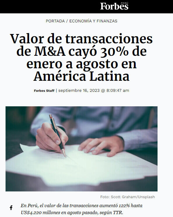En Perú se registraron 83 transacciones, lo que según TTR evidencia una tendencia estable, pero el valor de estas aumentó 122% y fue de US$ 4.220 millones.