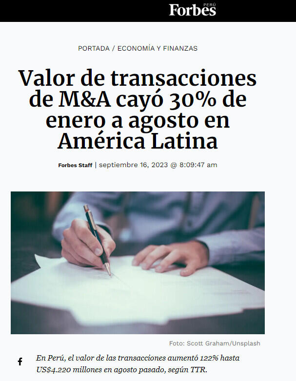 En Perú se registraron 83 transacciones, lo que según TTR evidencia una tendencia estable, pero el valor de estas aumentó 122% y fue de US$ 4.220 millones.