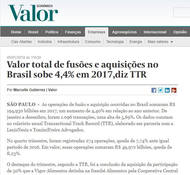 Valor total de fusões e aquisições no Brasil sobe 4,4% em 2017, diz TTR