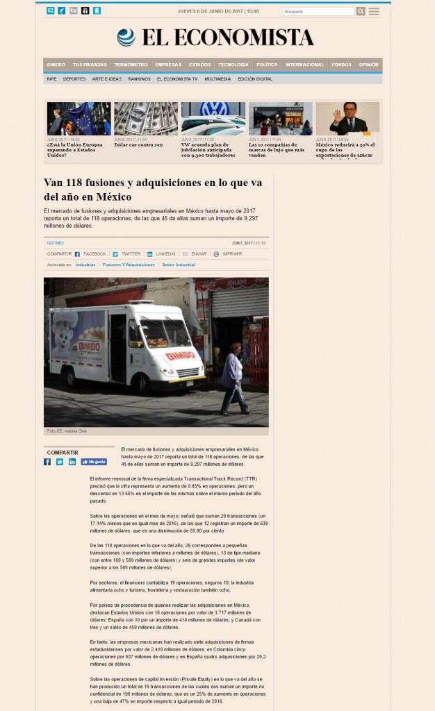 - El mercado de fusiones y adquisiciones empresariales en México hasta mayo de 2017 reporta un total de 118 operaciones, de las que 45 de ellas suman un importe de 9,297 millones de dólares.