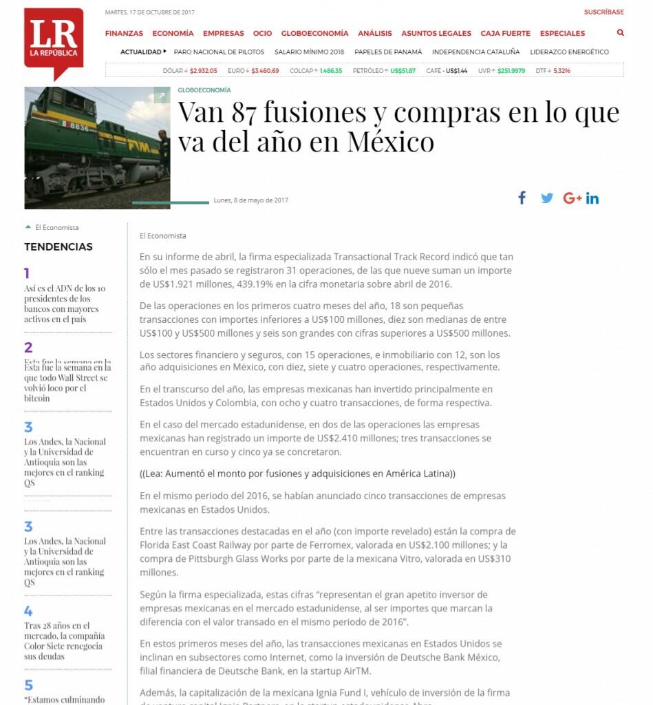 Según la firma especializada, estas cifras “representan el gran apetito inversor de empresas mexicanas en el mercado estadunidense, al ser importes que marcan la diferencia con el valor transado en el mismo periodo de 2016”.