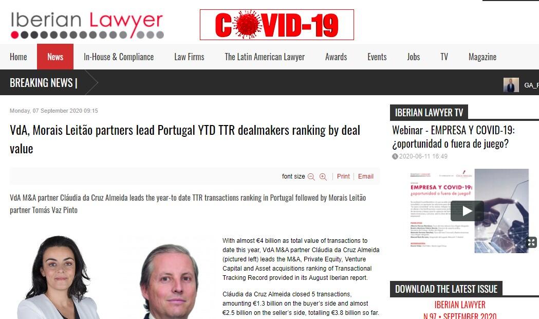 VdA, Morais Leitão partners lead Portugal YTD TTR dealmakers ranking by deal value
