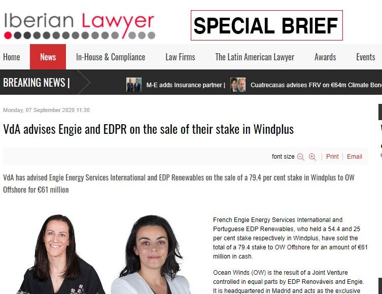 VdA has advised Engie Energy Services International and EDP Renewables on the sale of a 79.4 per cent stake in Windplus to OW Offshore for €61 million