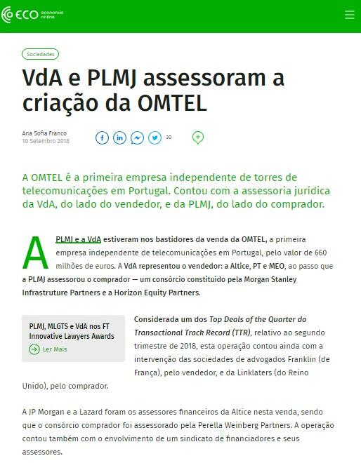 A PLMJ e a VdA estiveram nos bastidores da venda da OMTEL, a primeira empresa independente de telecomunicações em Portugal, pelo valor de660 milhões de euros. A VdA representou o vendedor: a Altice, PT e MEO, ao passo que a PLMJ assessorou o comprador — um consórcio constituído pela Morgan Stanley Infrastruture Partners e a Horizon Equity Partners.