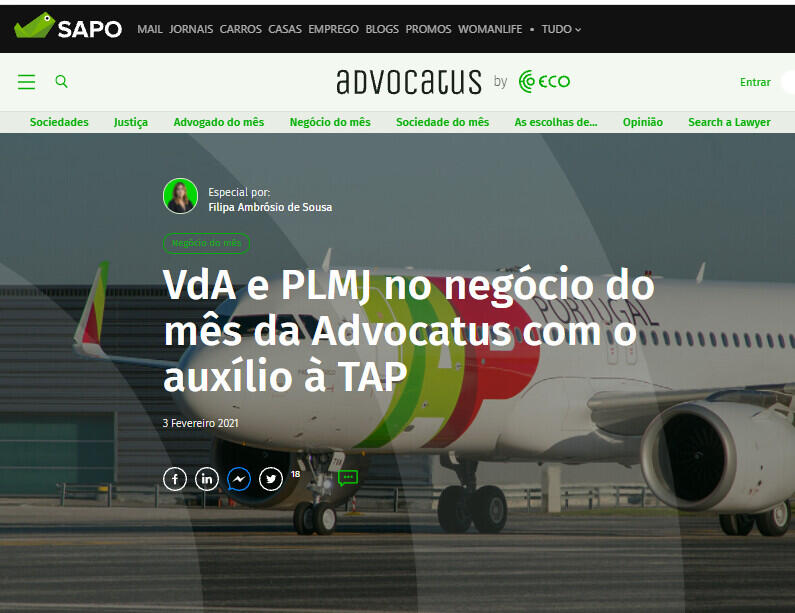 A Vieira de Almeida assessorou o Estado Português no contexto de um de auxílio à TAP e na aquisição de 22,5% do capital social da transportadora aérea. A PLMJ esteve com a transportadora aérea.