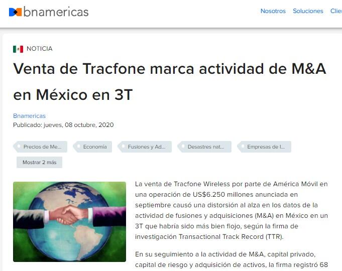 La venta de Tracfone Wireless por parte de América Móvil en una operación de US$6.250 millones anunciada en septiembre causó una distorsión al alza en los datos de la actividad de fusiones y adquisiciones (M&A) en México en un 3T que habría sido más bien flojo, según la firma de investigación Transactional Track Record (TTR).