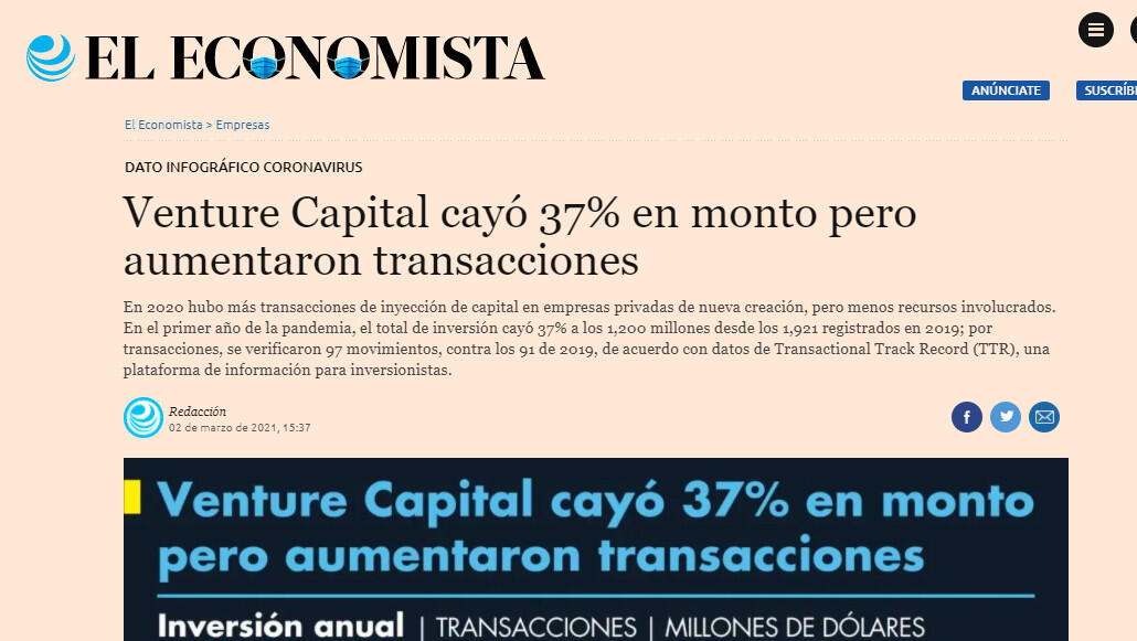En 2020 hubo más transacciones de inyección de capital en empresas privadas de nueva creación, pero menos recursos involucrados. En el primer año de la pandemia, el total de inversión cayó 37% a los 1,200 millones desde los 1,921 registrados en 2019; por transacciones, se verificaron 97 movimientos, contra los 91 de 2019, de acuerdo con datos de Transactional Track Record (TTR), una plataforma de información para inversionistas.