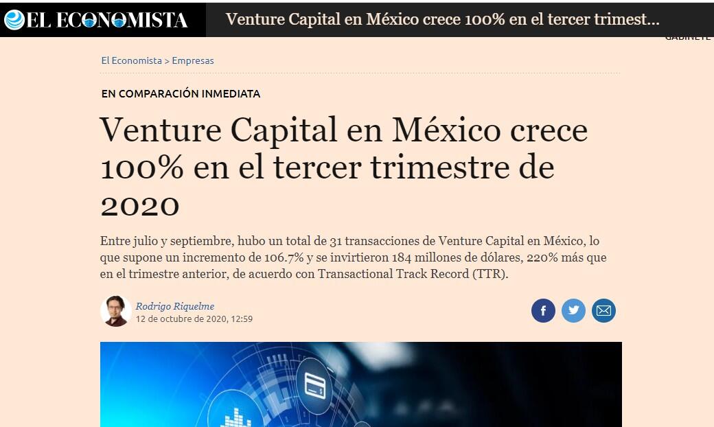 Las transacciones de capital de riesgo (Venture Capital) en México, durante el tercer trimestre del 2020, mostraron un fuerte crecimiento tanto en el número como en el monto total invertido con respecto al trimestre previo. Entre julio y septiembre, hubo un total de 31 transacciones de Venture Capital en México, lo que supone un incremento de 106.7% y se invirtieron 184 millones de dólares, 220% más que en el trimestre anterior, de acuerdo con Transactional Track Record (TTR).