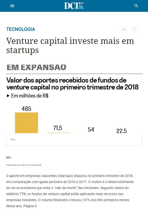 O aporte em empresas nascentes (startups) disparou no primeiro trimestre de 2018, em comparação com iguais períodos de 2016 e 2017. O motivo é o desenvolvimento de um ecossistema que evita o “vale da morte” das iniciantes. Segundo dados do relatório TTR, os fundos de venture capital estão aplicando mais recursos nas empresas iniciantes. O volume financeiro cresceu 137% nos três primeiros meses desse ano. Página 3