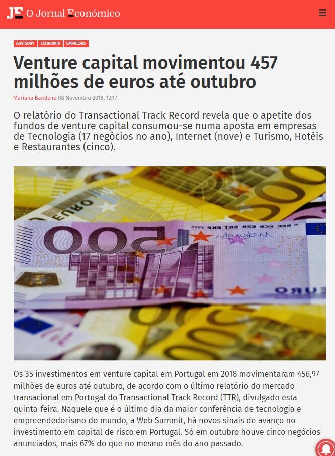 Os 35 investimentos em venture capital em Portugal em 2018 movimentaram 456,97 milhões de euros até outubro, de acordo com o último relatório do mercado transacional em Portugal do Transactional Track Record (TTR), divulgado esta quinta-feira. Naquele que é o último dia da maior conferência de tecnologia e empreendedorismo do mundo, a Web Summit, há novos sinais de avanço no investimento em capital de risco em Portugal. Só em outubro houve cinco negócios anunciados, mais 67% do que no mesmo mês do ano passado.