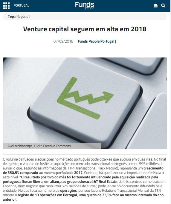 Apesar dos resultados menos positivos de agosto, a área de venture capital segue com dinâmica no ano de 2018. Desde janeiro foram 26 as operações registadas pela TTR, o que configura um crescimento de 18% face a 2017, somando 449 milhões de euros.