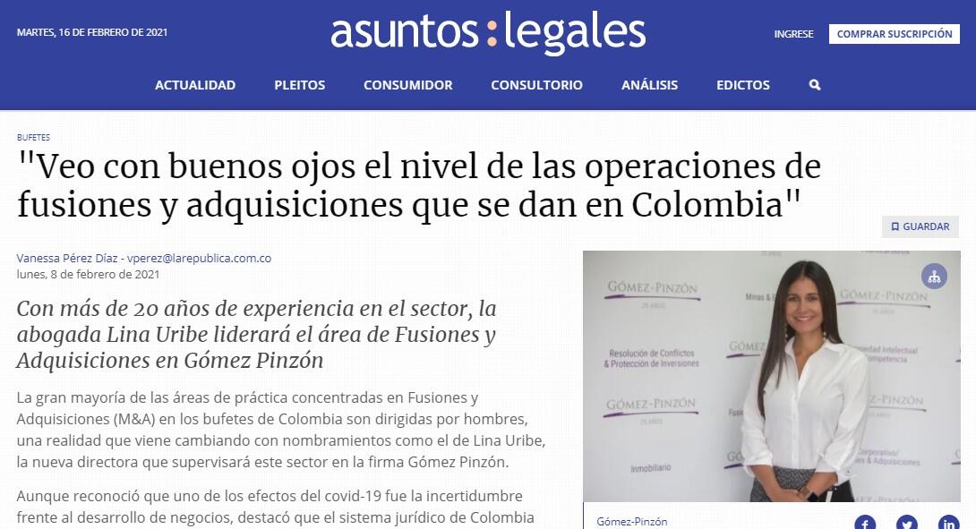 Con más de 20 años de experiencia en el sector, la abogada Lina Uribe liderará el área de Fusiones y Adquisiciones en Gómez Pinzón