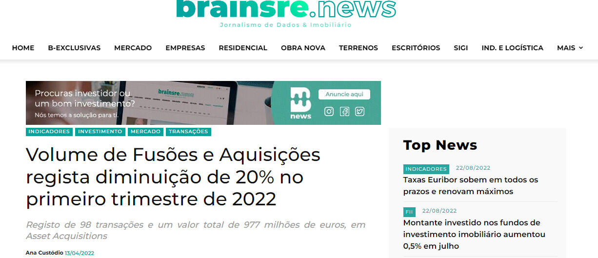 No primeiro trimestre de 2022, o mercado transacional português registou 98 operações com valor total de 977 milhões de euros, no qual 43% do total das transações possuem os valores revelados. Os números observam um decréscimo de 20% no número de transações quando comparado ao mesmo período de 2021, bem como uma queda de 74% do capital mobilizado.