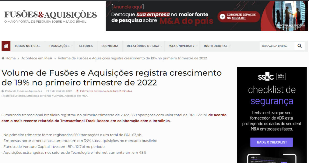 O mercado transacional brasileiro registrou no primeiro trimestre de 2022, 569 operações com valor total de BRL 63,9bi, de acordo com o mais recente relatório do Transactional Track Record em colaboração com o Intralinks.