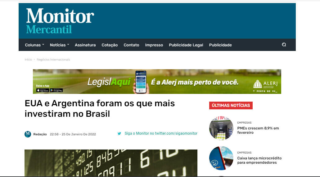 Em janeiro de 2022, as empresas brasileiras escolheram os Estados Unidos como seu principal destino de investimento, com três transações e um total de BRL 22,83m, seguido por Israel e Reino Unido, registrando uma operação cada. Os Estados Unidos e a Argentina, com 27 e seis transações, respectivamente, são os países que mais investiram no Brasil.