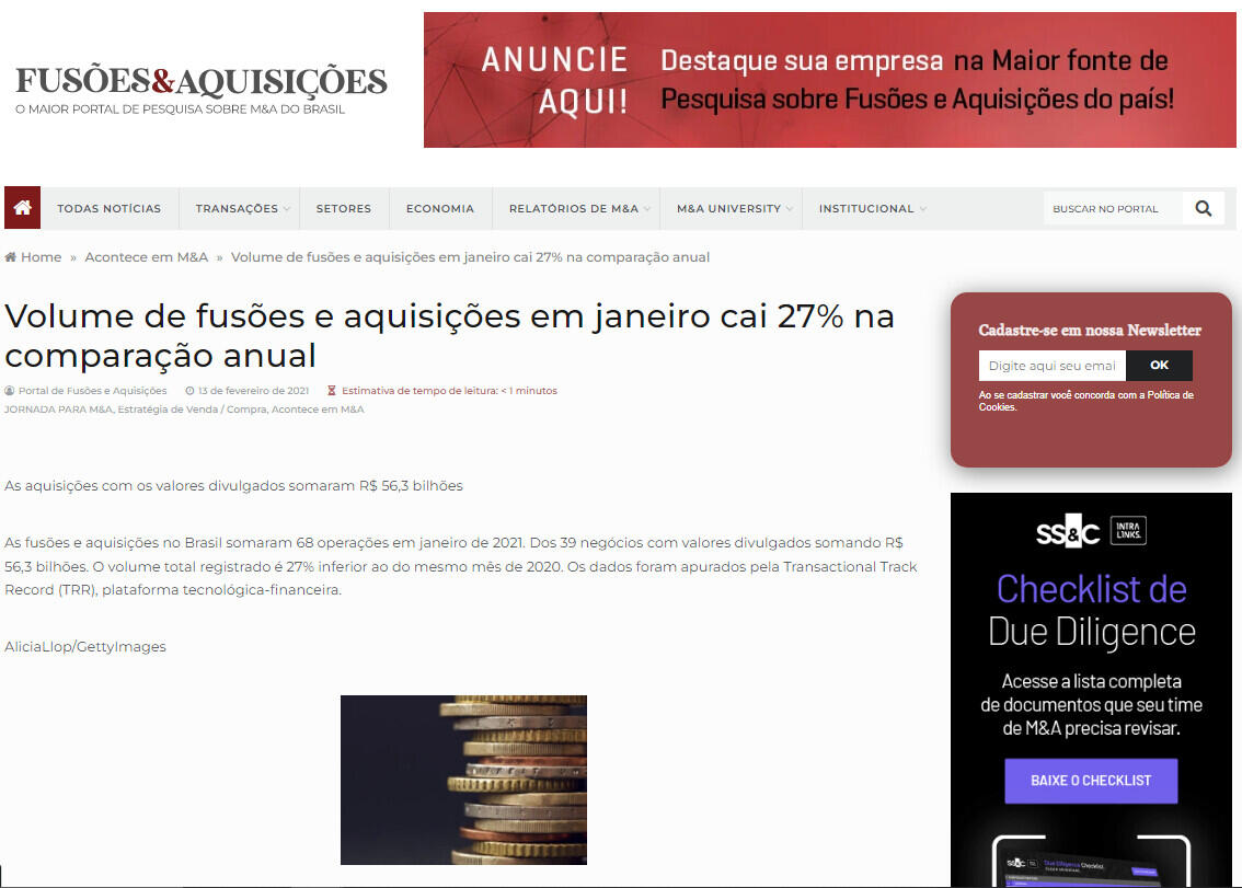 As fusões e aquisições no Brasil somaram 68 operações em janeiro de 2021. Dos 39 negócios com valores divulgados somando R$ 56,3 bilhões. O volume total registrado é 27% inferior ao do mesmo mês de 2020. Os dados foram apurados pela Transactional Track Record (TRR), plataforma tecnológica-financeira.