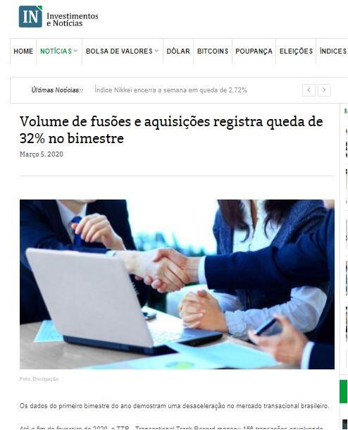 Até o fim de fevereiro de 2020, o TTR - Transactional Track Record mapeou 156 transações envolvendo empresas brasileiras, o que representa uma diminuição de 32% em relação ao mesmo período de 2019. Já no tocante ao valor total transacionado, foram movimentados aproximadamente R$ 21 bi, o que representa um modesto aumento de 4% em relação ao mesmo período do ano anterior.