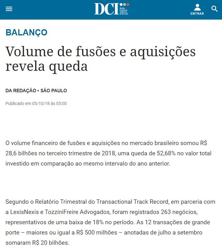 Segundo o Relatório Trimestral do Transactional Track Record, em parceria com a LexisNexis e TozziniFreire Advogados, foram registrados 263 negócios, representativos de uma baixa de 18% no período. As 12 transações de grande porte – maiores ou igual a R$ 500 milhões – anotadas de julho a setembro somaram R$ 20 bilhões.
