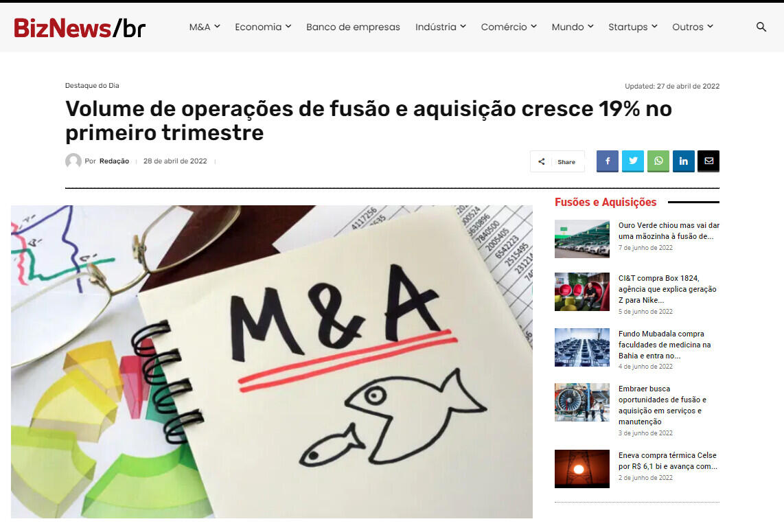 Volume de operações de fusão e aquisição cresce 19% no primeiro trimestre