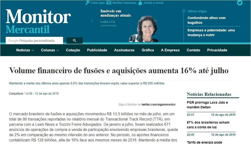 O mercado brasileiro de fusões e aquisições movimentou R$ 13,5 bilhões no mês de julho, em um total de 86 transações reportadas no relatório mensal do Transactional Track Record (TTR), em parceria com a Lexis Nexis e Tozzini Freire Advogados. De janeiro a julho, foram realizados 671 anúncios de operações de compra e venda de participação envolvendo empresas brasileiras, queda de 2% em comparação ao mesmo intervalo do ano anterior. No período, os aportes financeiros contabilizam R$ 128 bilhões, alta de 16% face aos mesmos meses de 2018. Mantendo a média dos últimos anos apenas 6,6% das transações tiveram equity value superior a R$ 500 milhões.