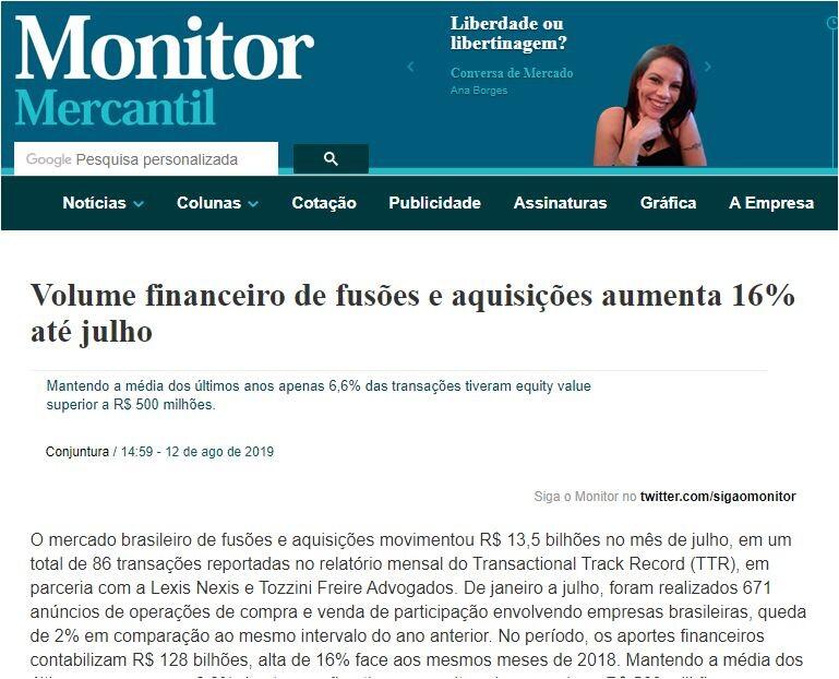 O mercado brasileiro de fusões e aquisições movimentou R$ 13,5 bilhões no mês de julho, em um total de 86 transações reportadas no relatório mensal do Transactional Track Record (TTR), em parceria com a Lexis Nexis e Tozzini Freire Advogados. De janeiro a julho, foram realizados 671 anúncios de operações de compra e venda de participação envolvendo empresas brasileiras, queda de 2% em comparação ao mesmo intervalo do ano anterior. No período, os aportes financeiros contabilizam R$ 128 bilhões, alta de 16% face aos mesmos meses de 2018. Mantendo a média dos últimos anos apenas 6,6% das transações tiveram equity value superior a R$ 500 milhões.